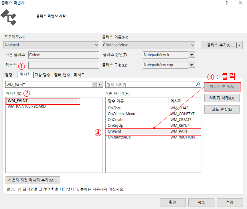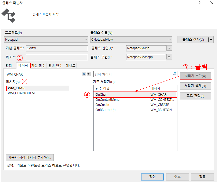 ③ WM_CHAR 메세지 함수(OnChar) : 문자 출력.