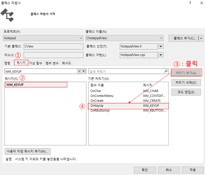 ④ WM_KEYUP 메세지 함수(OnKeyUp) : WM_CHAR 메시지는 출력이 불가능한 키(기능키, SHIFT, CTRL, ALT, 방향키 등)를 처리할수 없으므로, 방향키를 처리하기 위해 WM_KEYUP 메세지 함수 추가.