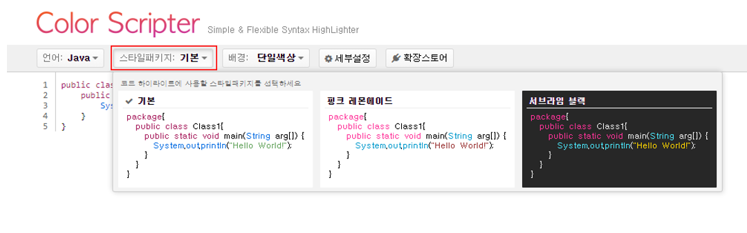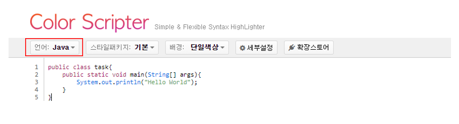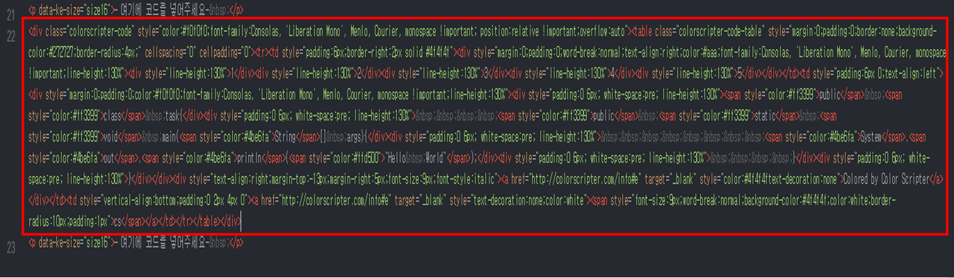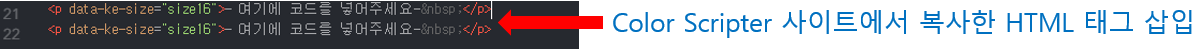 ② <P>~</P> 부분 대신 Color Scripter 사이트에서 복사한 소스코드 HTML 태그 삽입