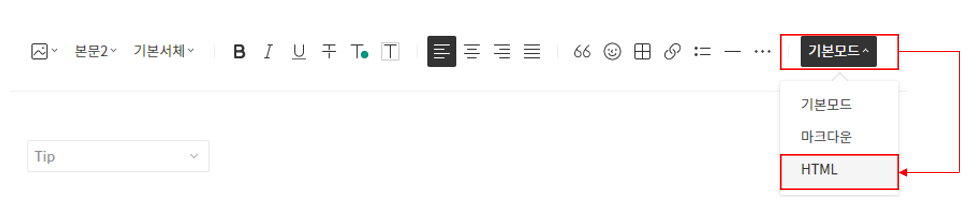 ④ 티스토리 블로그 상단에서 기본 모드 → HTML로 변경