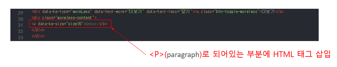 ⑤ 복사한 HTML 태그를 원하는 위치에 넣은 후 다시 기본 모드로 변경