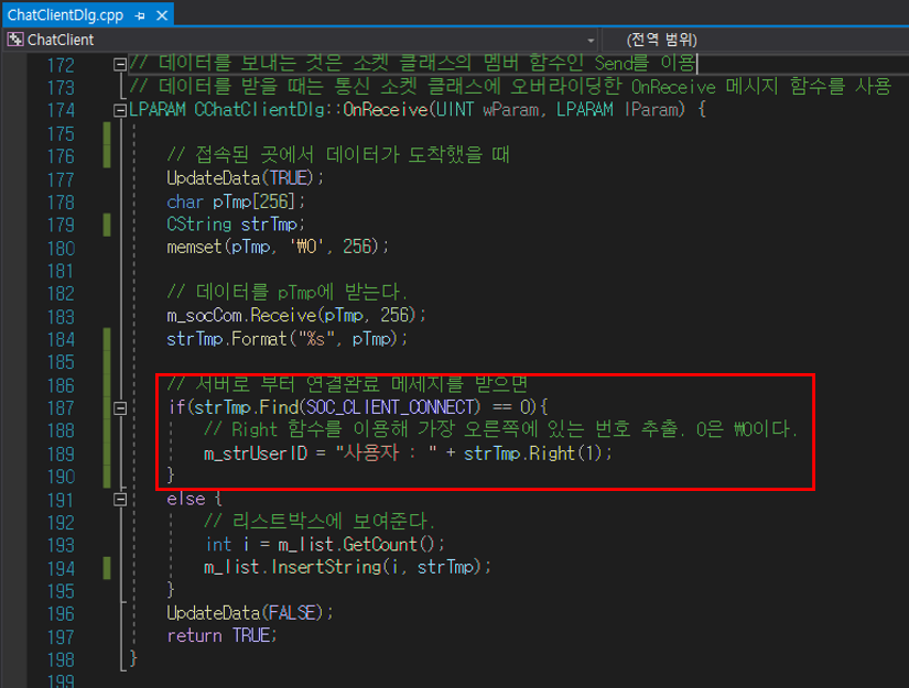 ② OnReceive() : 서버로부터 SOC_CLIENT_CONNECT 메시지를 받으면 사용자 번호를 부여 받음