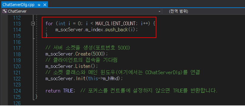 ① CSocCom m_socCom[MAX_CLIENT_COUNT] : 배열로 변환하여 관리(여기서는 3개)
