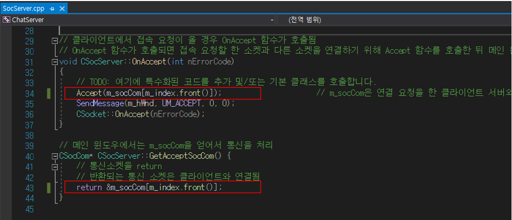 Accept(m_socCom[m_index.front()]); // m_socCom은 연결 요청을 한 클라이언트 서버와 실제 연결이 되는 소켓