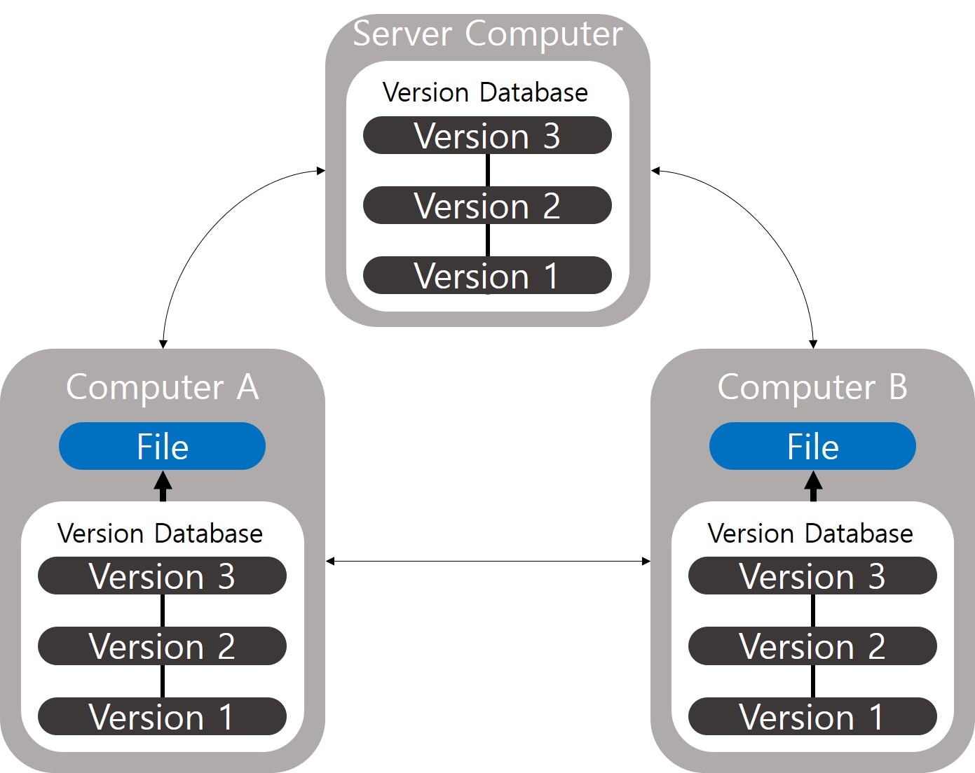 서버뿐만 아니라 모든 사용자가 모든 버전에 대한 히스토리를 가지고 있기 때문에, 로컬에서도 수정 이력과 내용을 볼 수 있다. 그리고 인터넷 연결 문제 때문에 작업에 지장을 받지 않으며, 만약 중앙 Server나 로컬 컴퓨터가 고장 나도, 정상적인 로컬이 하나만 살아 있어도 모든 데이터를 복원하는데 문제가 되지 않기 때문에 가장 안정적이고, 편리하나, 이는 로컬의 저장 공간을 점유한다는 단점이 존재한다.