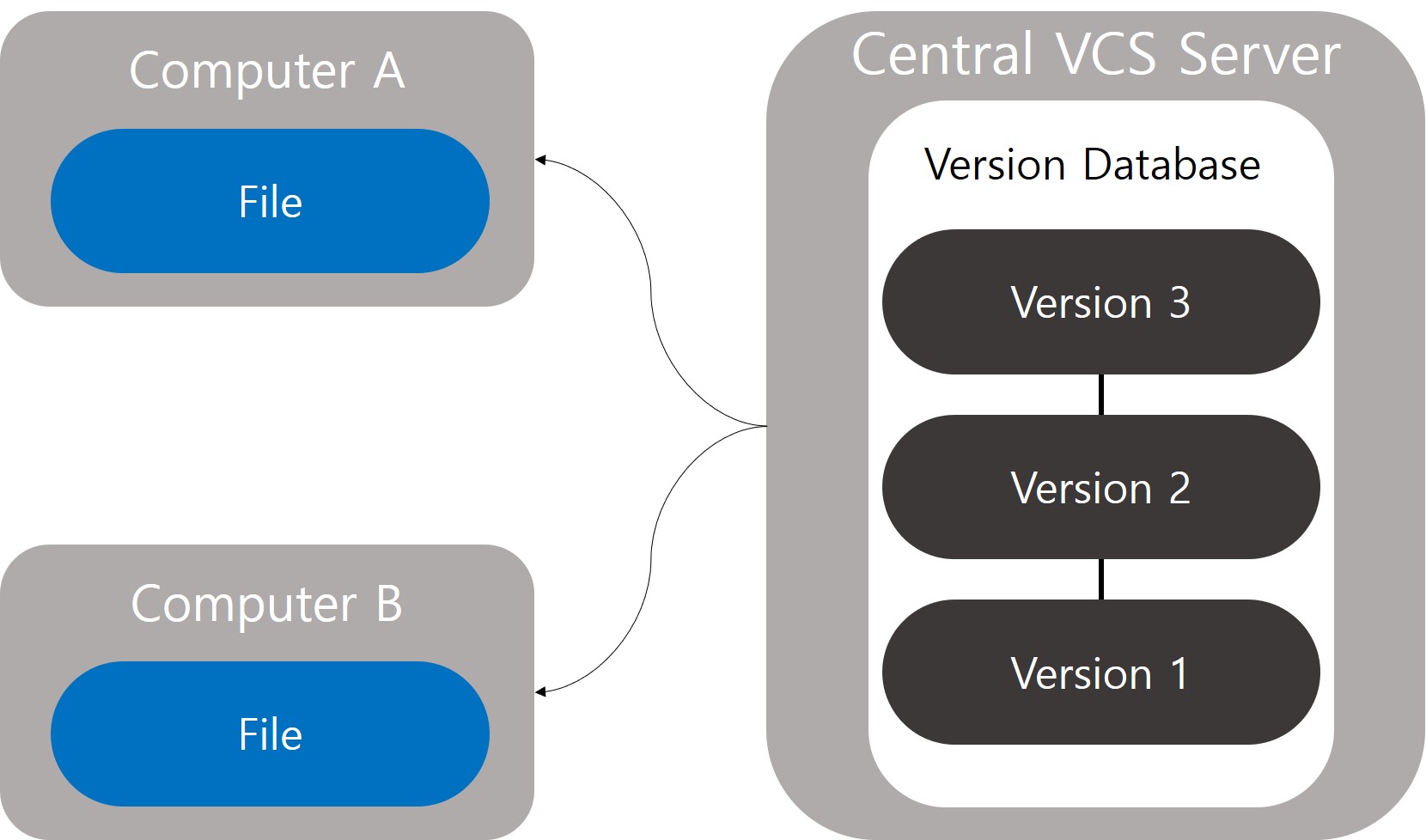 중앙 Server에서 모든 버전의 데이터를 관리 및 저장하며, 수정하기 위해서는 Server에 요청해 파일을 받은 후 수정하고, 다시 Server에 올리는 방식이다. 로컬 버전 관리보다 협업이 쉬워지고 관리자가 누가 어떤 일을 하고 있는지 알기 쉬운 장점이 있다. 하지만 단점으로 2개를 꼽을 수 있다.