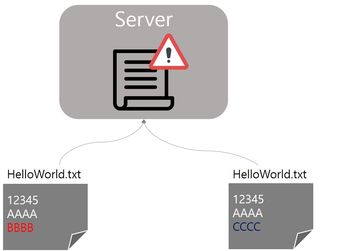 간단한 예시로 같은 파일을 2명의 작업자가 중앙 Server로부터 받은 이후 각자 다른 내용을 수정 후 다시 Server에 올렸을 때 두 개의 수정내용 중 한 개만 반영되는 수정 충동 문제가 발생할 수 있다.